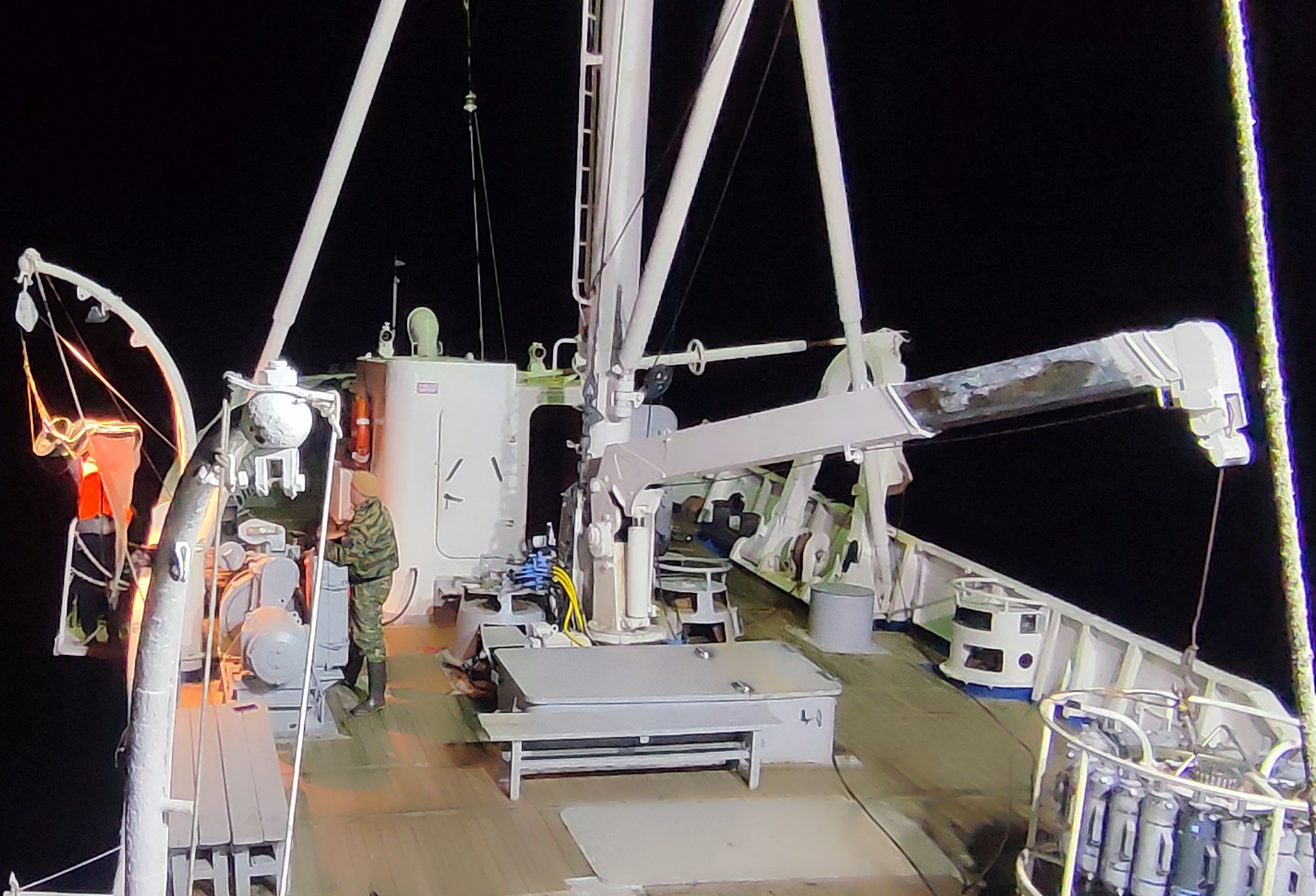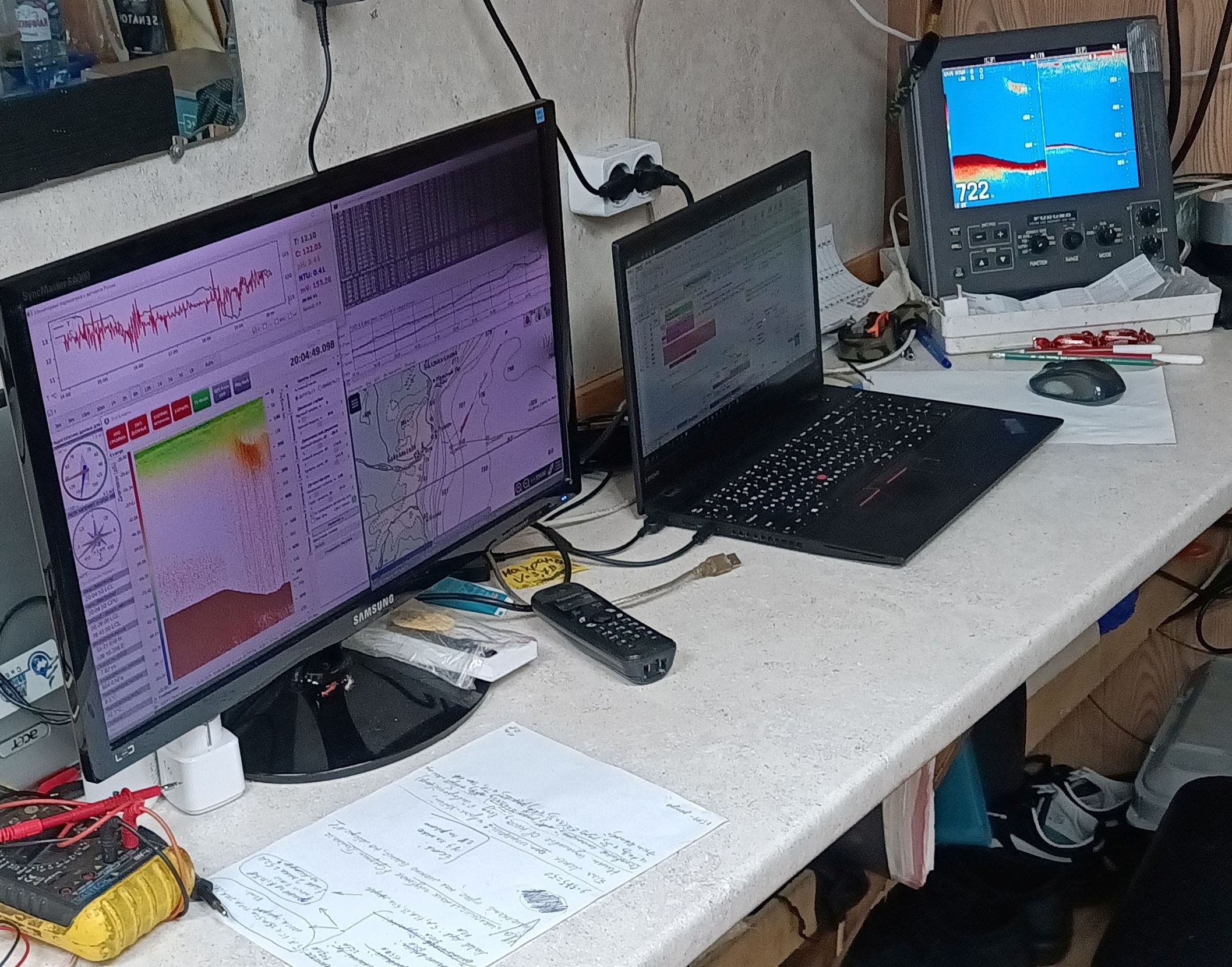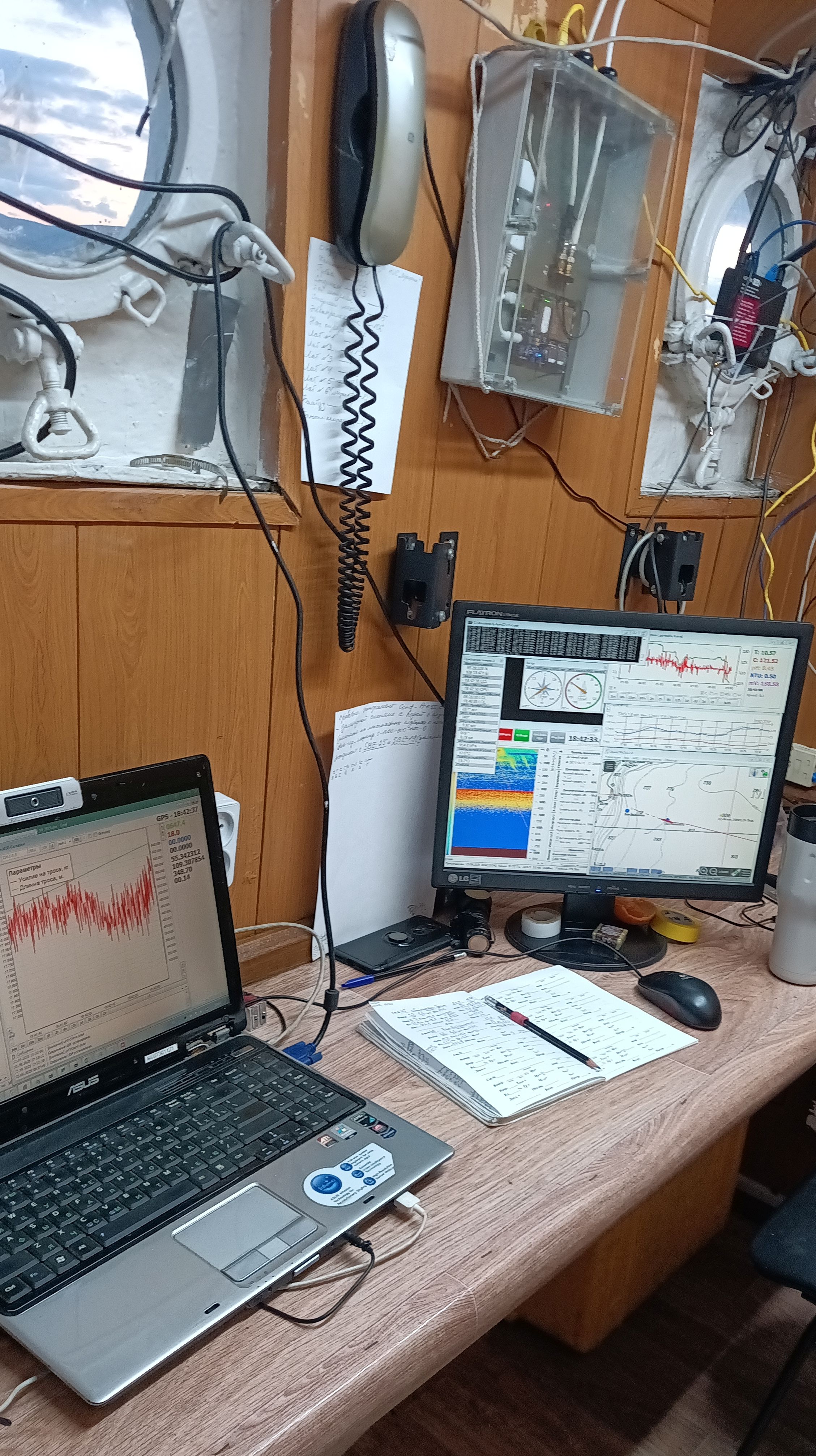 Одновременно с основными работами на переходах между станциями на ходу судна проводились измерения с параллельной записью в подповерхностном слое температуры, минерализации, pH и мутности воды, а также концентрации растворенного метана. В течение всего срока экспедиции проводился мониторинг пузырьковых выходов газа (ПВГ) с использованием программно-аппаратного комплекса, на основе эхолота Furuno с записью данных эхограмм.