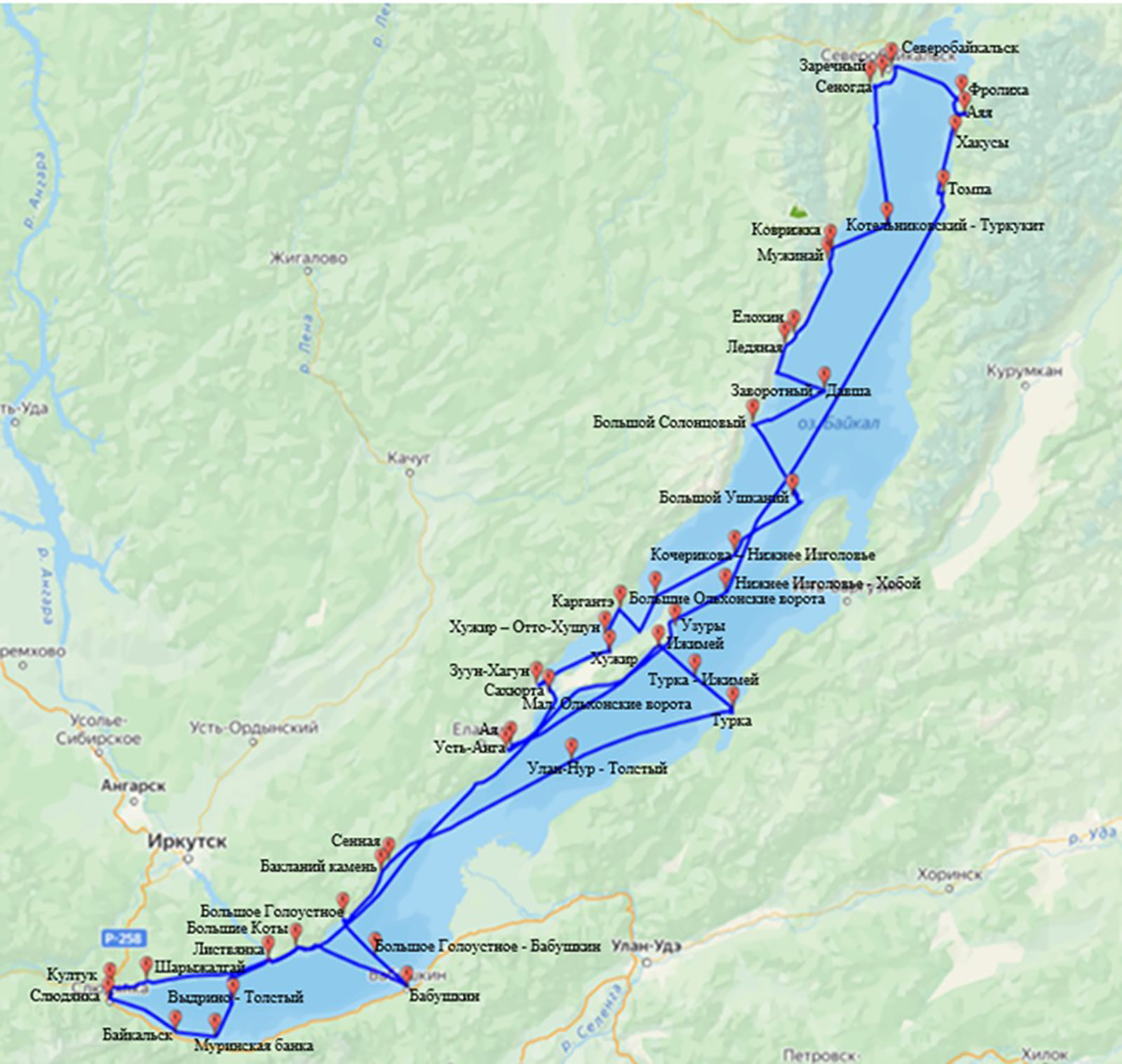 - губа Сенная (близ бух. Песчанной): N52°16′58.5″, E105°44′07.9″