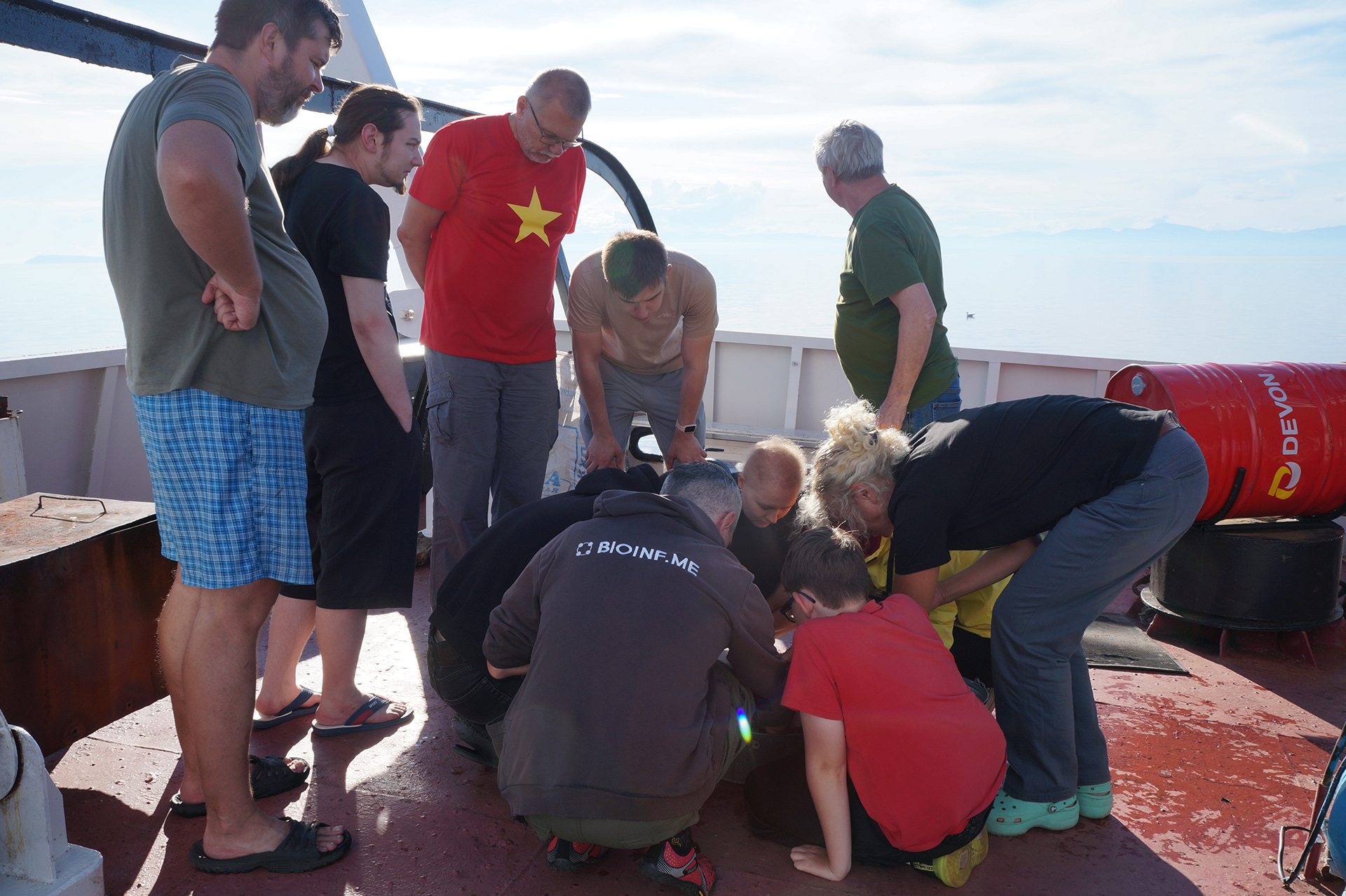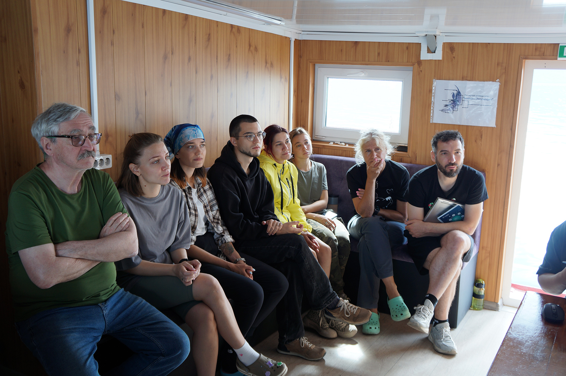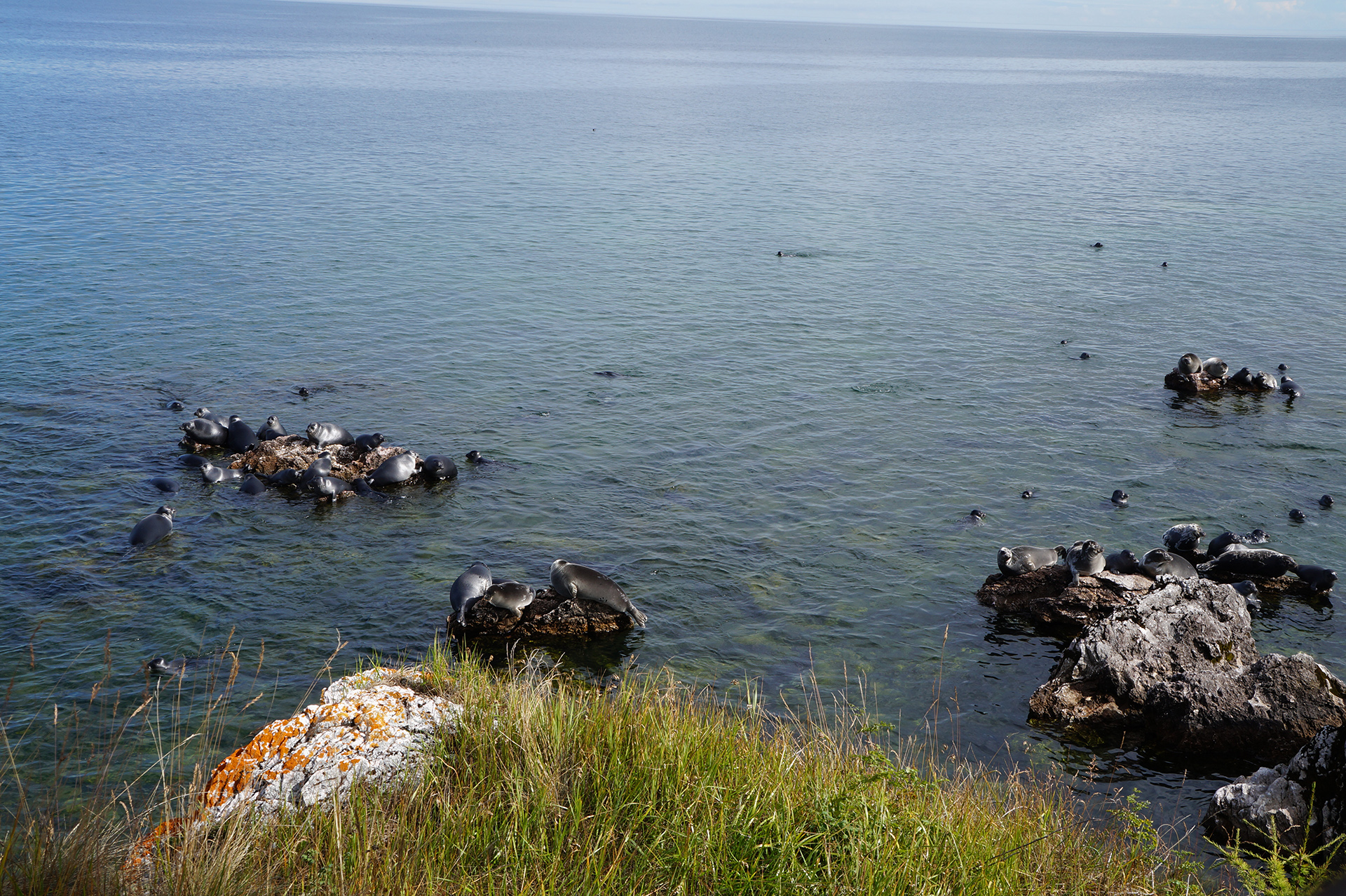 Утром группа совершила исследовательский поход по острову Тонкий (53.856551, 108.710976) в архипелаге Ушканьи острова. Участники наблюдали за лежбищем байкальских нерп (Phoca sibirica), изучая их поведение в естественной среде обитания. На берегу в литорали были собраны образцы мшанок (Bryozoa), предположительно представляющих редкий неописанный вид, что вызвало оживленные обсуждения.