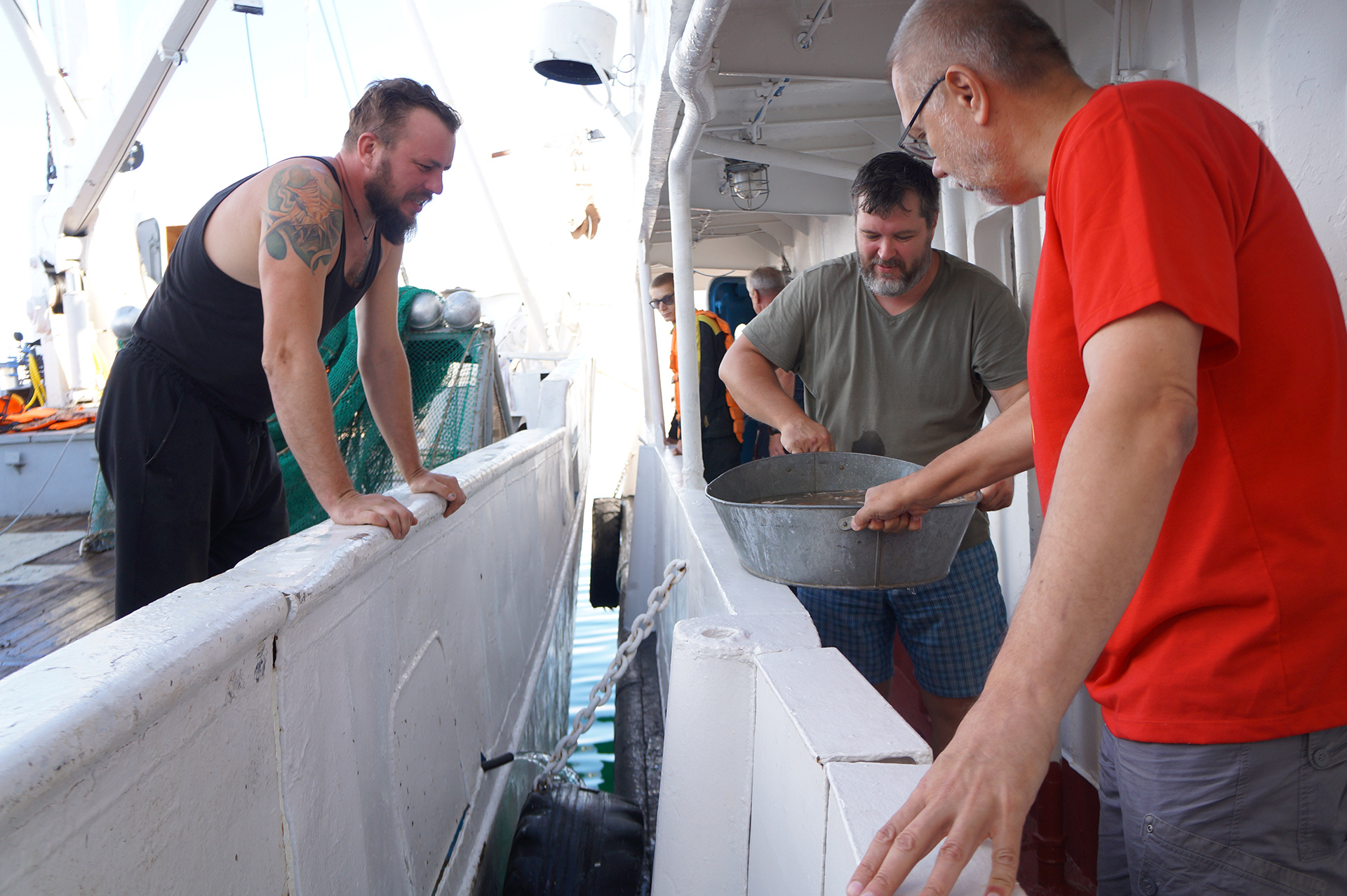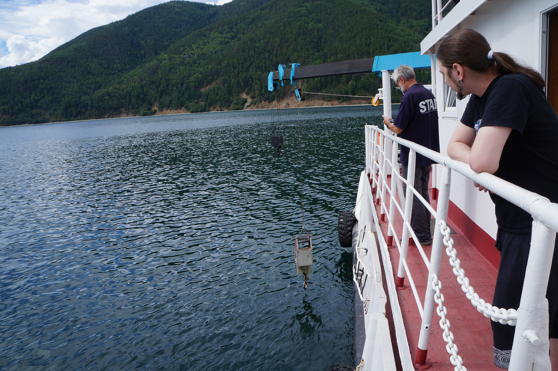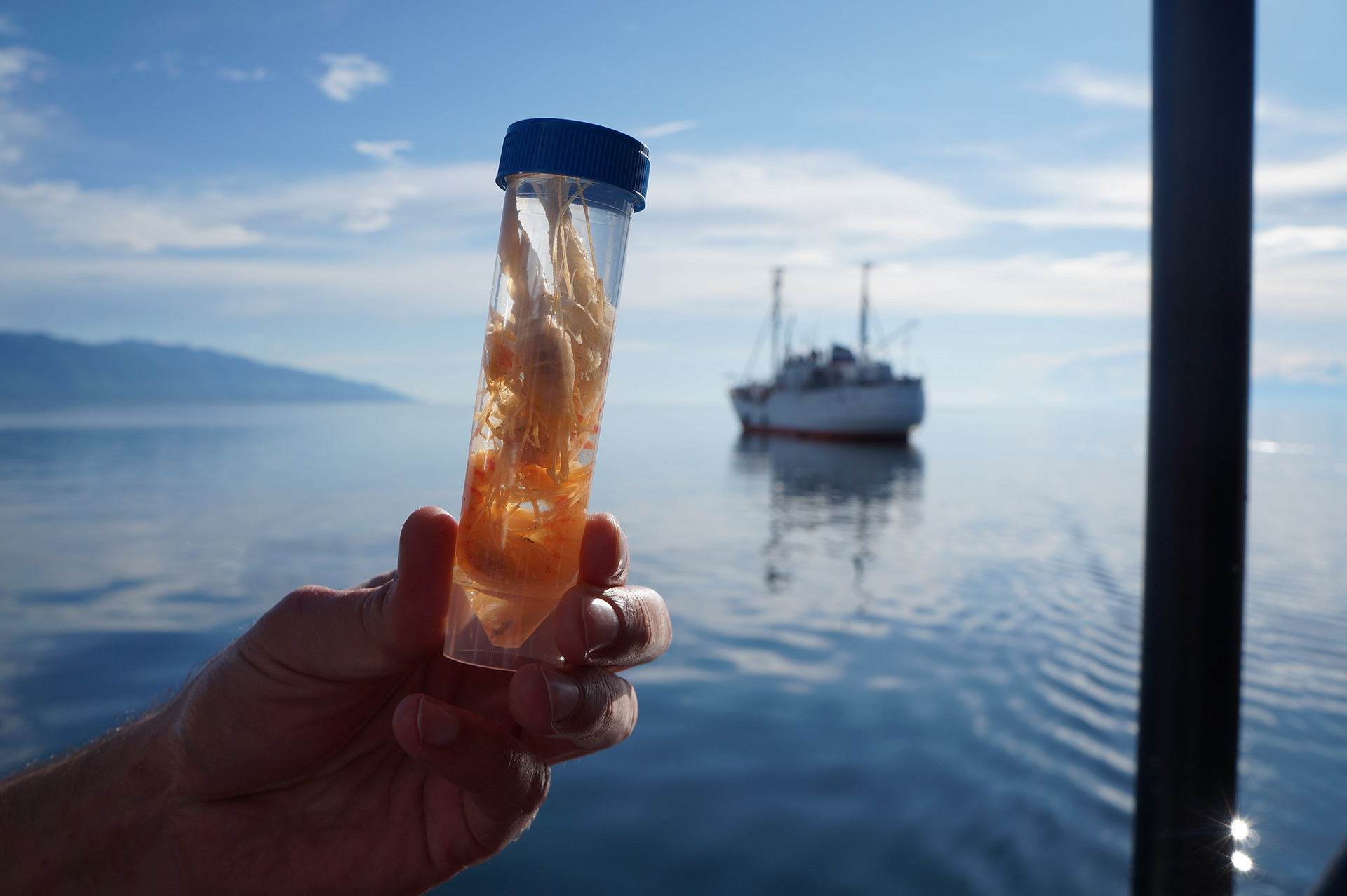 После лекции группа встретила научно-исследовательское судно (НИС) "Верещагин", с которого было совершено глубоководное траление с глубины 790 м. Участники познакомились с глубоководной фауной, включая амфипод (Amphipoda), голомянок (Comephorus) и широколобок (Pelvicachromis). Н.С. Мюге представил обзор адаптаций глубоководных рыб к давлению и темноте, Д.Ю. Щербаков — функциональные приспособления амфипод к жизни на глубине, а М.В. Райко собрал образцы микроспоридий (Microsporidia). Участники смогли рассмотреть образцы под бинокуляром.