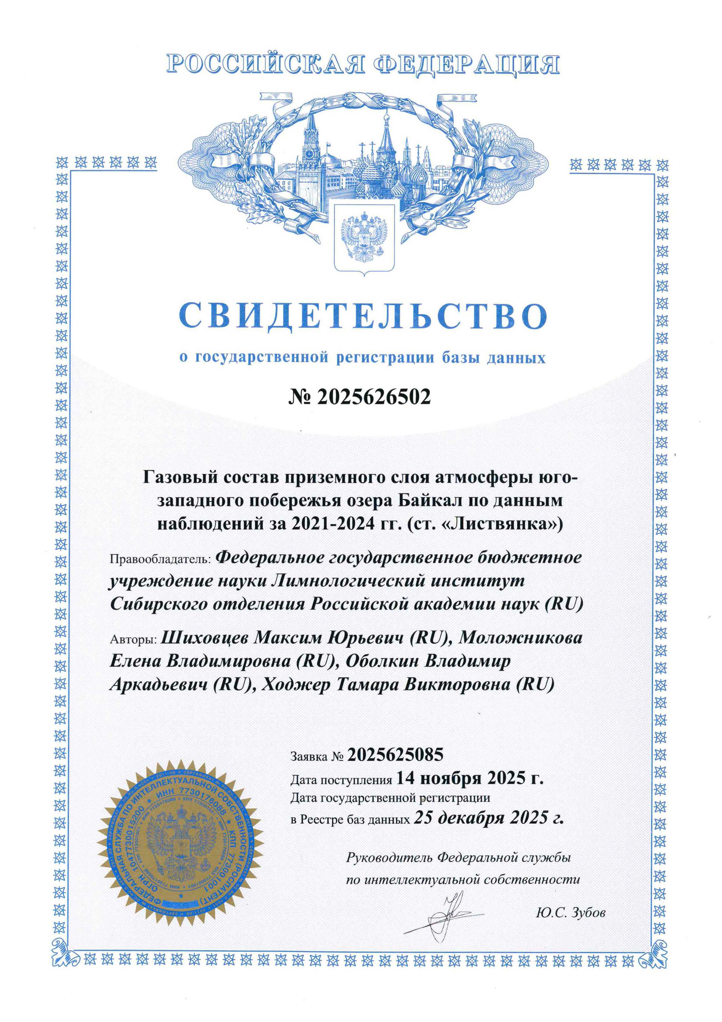 База данных: «Газовый состав приземного слоя атмосферы югозападного побережья озера Байкал по данным наблюдений за 2021-2024 гг. (ст. “Листвянка”)» Свидетельство о государственной регистрации базы данных № 2025626502 Заявка №2025625085 Дата государственной регистрации в Реестре баз данных: 25.12.2025 Авторы: Шиховцев Максим Юрьевич (RU), Моложникова Елена Владимировна (RU), Оболкин Владимир Аркадьевич (RU), Ходжер Тамара Викторовна (RU) Правообладатель: Федеральное государственное бюджетное учреждение науки Лимнологический институт Сибирского отделения Российской академии наук (ЛИН СО РАН) (RU)
